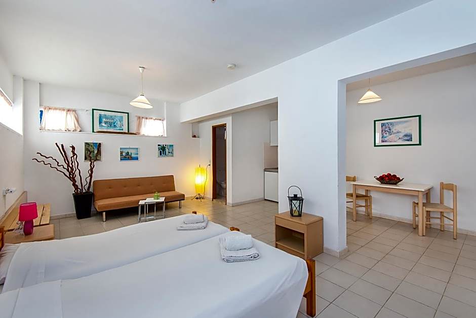 Accommodation options include an Apartment at 753 square feet that accommodates 2 adults and 1 child with four twin beds, plus Studio Inland View and Studio Garden View configurations, as well as Double and Twin rooms for various group sizes. An inviting mix of indoor comfort and outdoor space, like a garden or patio, makes it easy to plan a cozy meal or a relaxing evening under the Rhodes skies.
